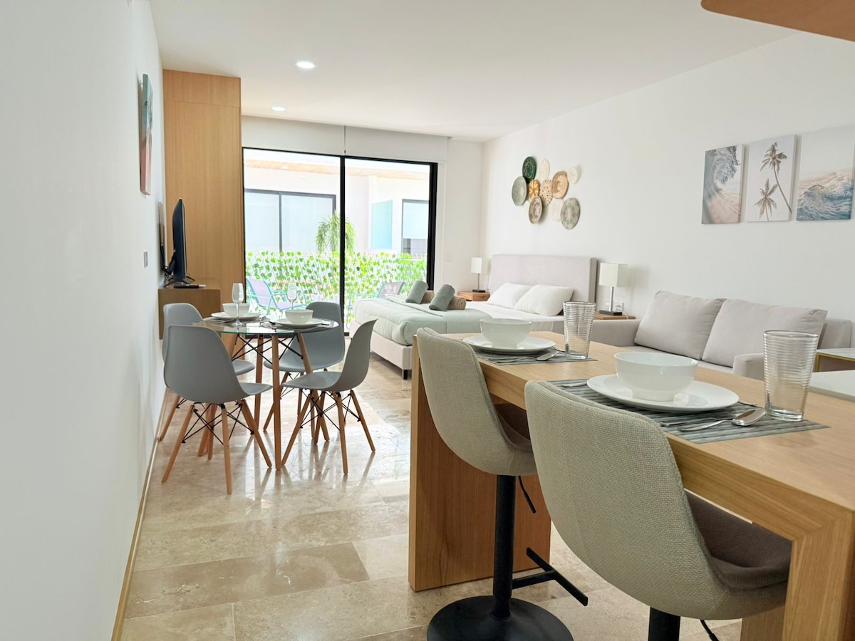 To čudovito stanovanje se nahaja le nekaj korakov od legendarne Pete avenije, vendar ne da bi na njega vplival vrvež tega območja, je to čudovito stanovanje idealen kraj za uživanje na rivieri Maya. Med bivanjem lahko dostopate do strehe stavbe s čudovitim bazenom, pogledom na ocean in otokom Cozumel. Imeli boste tudi dostop do skupnega delovnega prostora in telovadnice.