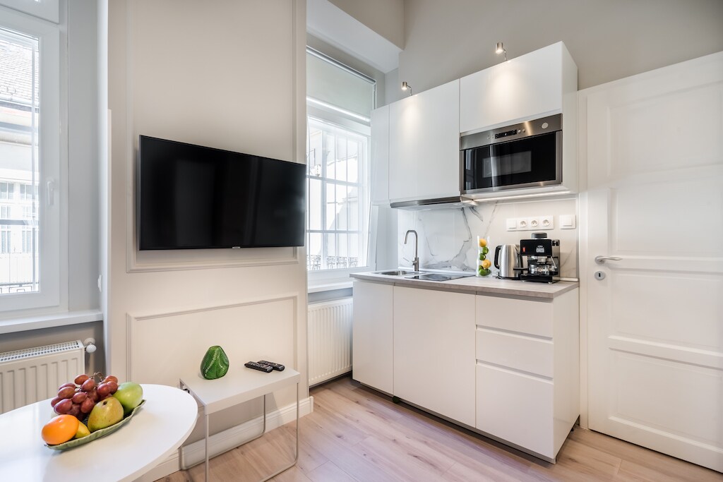 The historic building on which this property sits also houses a Michelin-star restaurant at street level. This renovated flat offers the great feel of a turn-of-the-century building, with a high ceiling, tall old doors, and new double-glazed windows, yet a modern layout with all 21st-century features built in. The area is very central and full of restaurants and coffee houses. It is close to the Basilica and only a short walk to the Danube. The Synagogue and the ruin pubs are within 10 minutes.