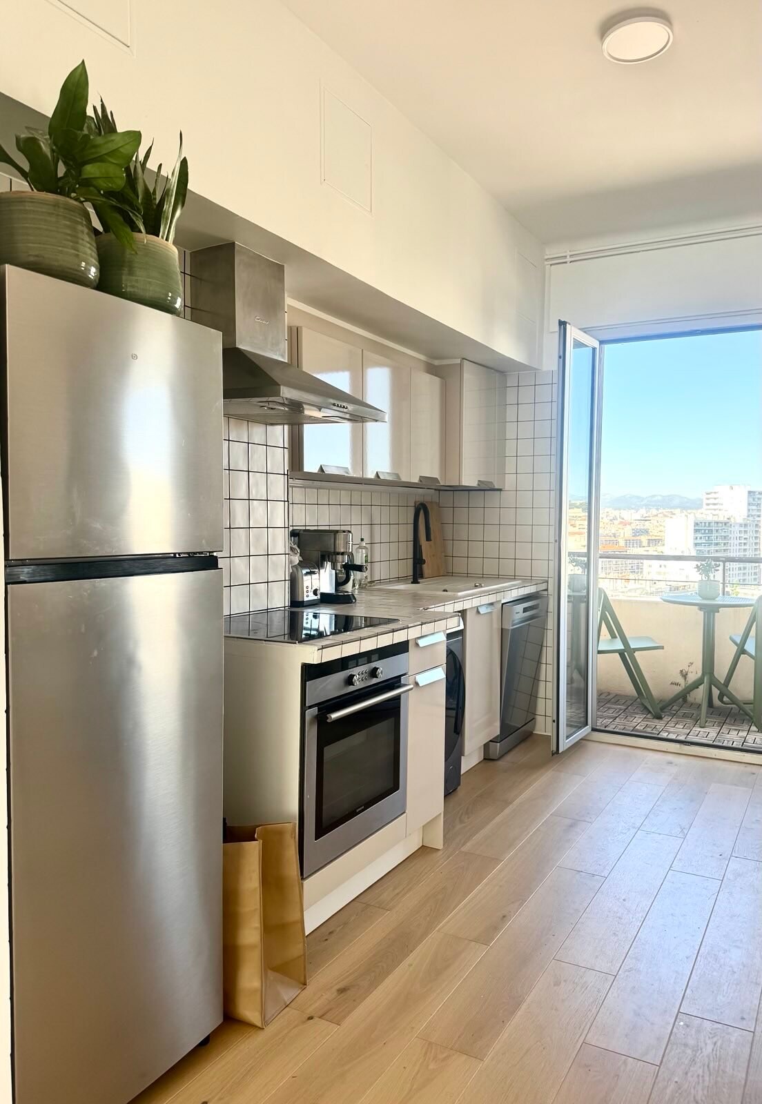 v 7. nadstropju z dvigalom je stanovanje leta 2021 v celoti prenovil arhitekt. Velika dnevna soba, obdana s soncem, in odprta kuhinja s pogledom na morje. Ti dve sobi imata neposreden dostop do terase Velik hodnik vodi do spalnega prostora, kjer se nahajata dve klimatizirani spalnici. Izjemna lokacija: - 2 minuti od katalonske plaže - 3 minute od Palais du Pharo - 10 min od pristanišča Vieux Registracijska številka:13207015531DP