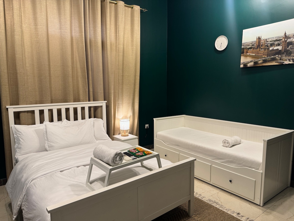 Zelo udoben prostor s kopalnico in kuhinjo v družinskem stanovanjskem kompleksu. Do nakupovalnega središča Duball in Burj Khalife je le približno 10 minut vožnje z avtomobilom. Nahaja se v zelo mirni soseski z brezplačnim parkiranjem v sklopu prenočišča. To je zelo sproščeno in sproščujoče vzdušje ter je okusno opremljeno. Ima zelo udobno posteljo in raztegljiv kavč za dodatni 2 osebi. Za sprostitev je na voljo 50-palčni pametni televizor. Prihod je prilagodljiv in možen non stop.