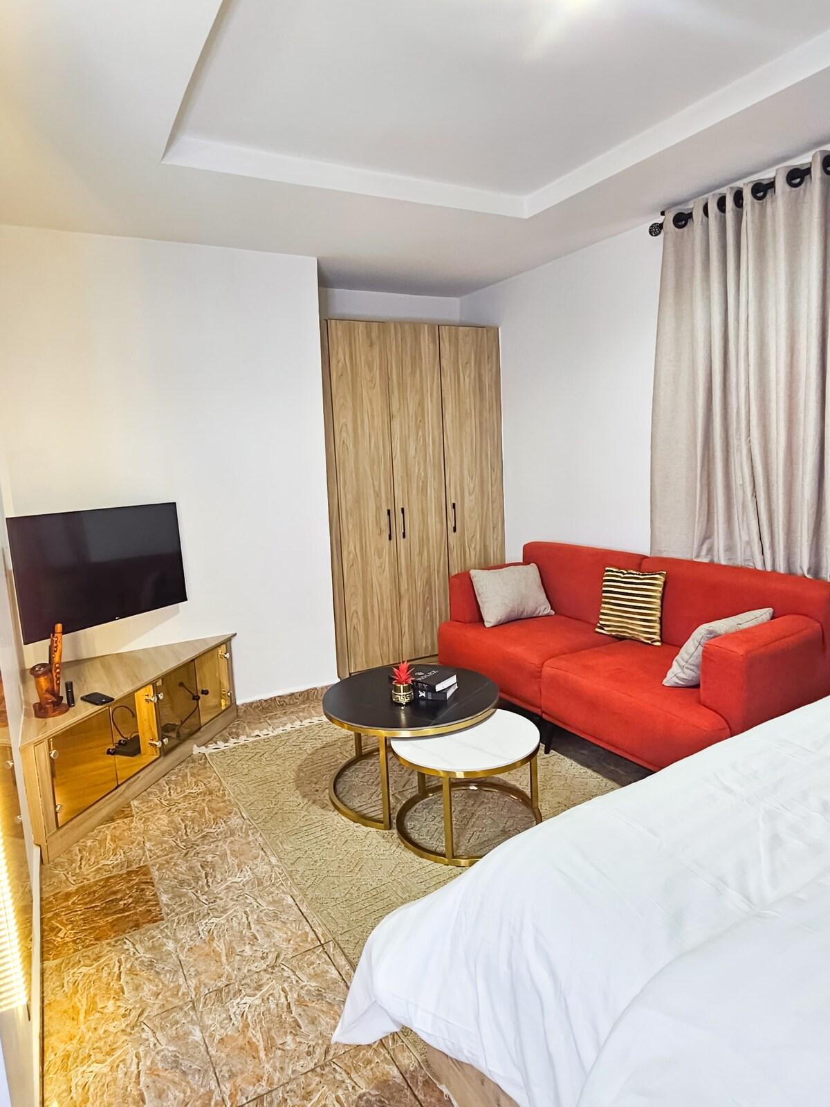 Sprostite se v tem mirnem, oblikovalskem enosobnem stanovanju v Jahiju v Abuji. S toplimi, zemeljskimi toni, udobnim salonom, zasebnim balkonom in popolnoma opremljeno kuhinjo je kot nalašč za pare, popotnike, ki potujejo sami, in delavce na daljavo. Uživajte v hitrem Wi-Fi-ju, elegantni notranjosti in mirnem vzdušju le nekaj minut stran od mestnega vrveža. Vaš sodoben dom daleč od doma.