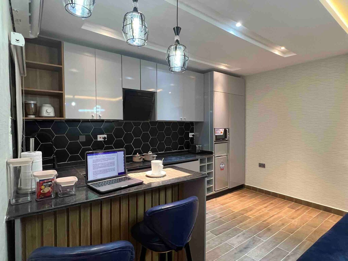 Escape the hustle of the city in this spacious, stylish studio apartment. The contemporary aesthetic of this space is perfect for couples’ getaways or solo travellers It is fully furnished + located in a secure estate. The space is serviced with free, super-fast Wifi & ample parking space The kitchen is fitted with modern equipment for your convenience. With 24/7 electricity, our smart TV & other luxurious amenities make this a home away from home, with the trappings of a dreamy hotel suite.