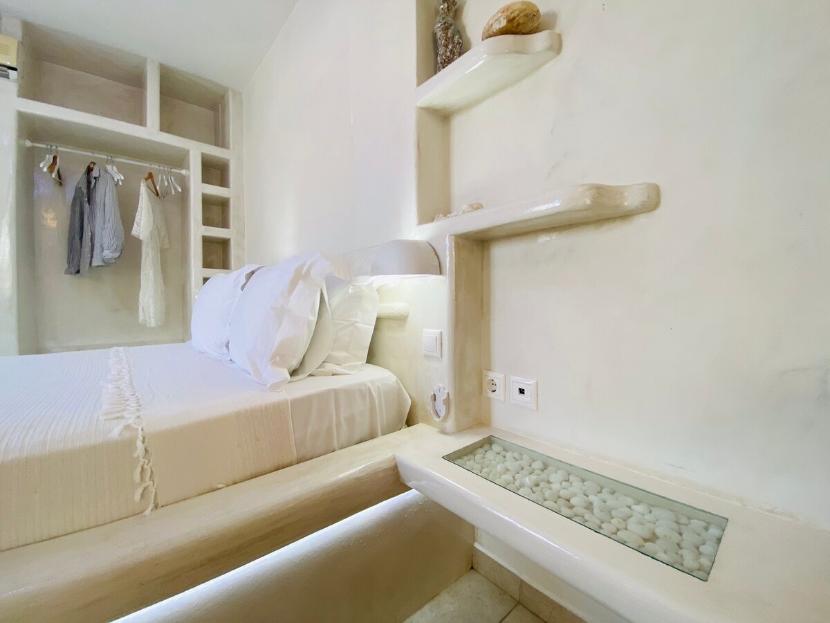 KLEFTIKO Smart Suite was created following the Cycladic traditional style with handmade and unique solid wooden furniture, the Cocomat bed & special decorative. In KLEFTIKO, you will find the biggest iron face & also special wooden beside tables, stool, chair & lighting outfits. Aiming to a better customer experience, special smart automations were harmoniously integrated. You will switch on the lights, air condition and TV, either manually or using simple voice commands to Alexa Voice Guide.