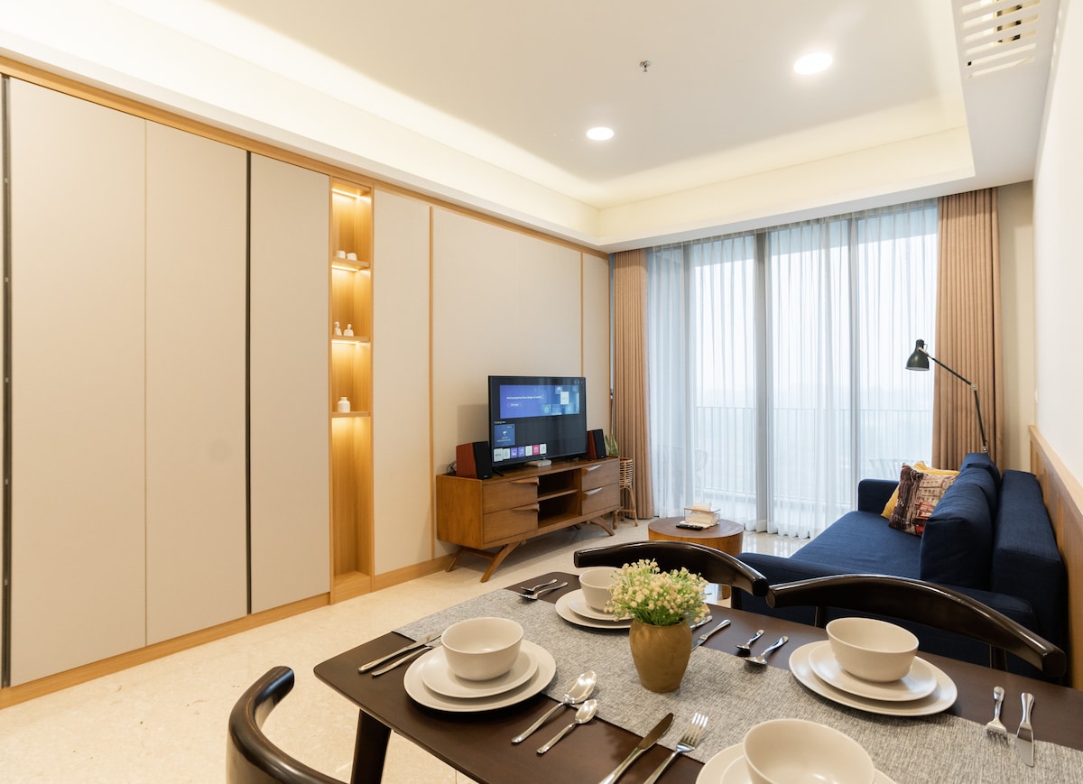 BRAND NEW Aprtemen Nara House dengan konsep Japanese style yang hangat, rapi, dan menenangkan. Interior didominasi material kayu dengan pencahayaan lembut, menciptakan suasana rumah yang nyaman dan elegan. Unit terasa luas & lega, dengan ruang tamu & ruang makan yang tertata apik, dapur fungsional, serta kamar tidur nyaman. Cocok untuk profesional, pasangan, maupun Anda yang menyukai hunian tenang & estetik. Lokasi sangat strategis, dekat dengan mall, pusat kuliner, & berbagai fasilitas umum.
