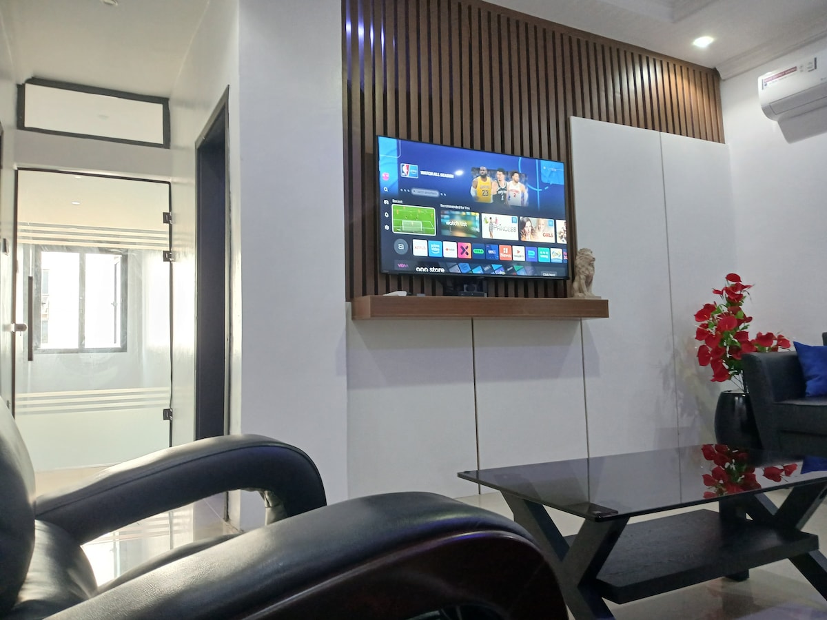Standardna spalnica s delno ortopedsko super veliko udobno vzmetnico, sodobna kopalnica z grelnikom vode. Neomejen hiter WI-FI, 43-palčna pametna televizija v spalnici in 55-palčna pametna televizija v dnevni sobi, Netflix, YouTube, DSTV, detektor dima, non stop elektrika z omrežjem Band A, zaradi česar je moje bivališče edinstveno brez zatemnitve, Cctv, maksimalna varnost, 10 minut do mednarodnega letališča in 5 minut do domačega letališča. Bleščeče čisto, prostorno in dobro urejeno stanovanje za vaše udobje