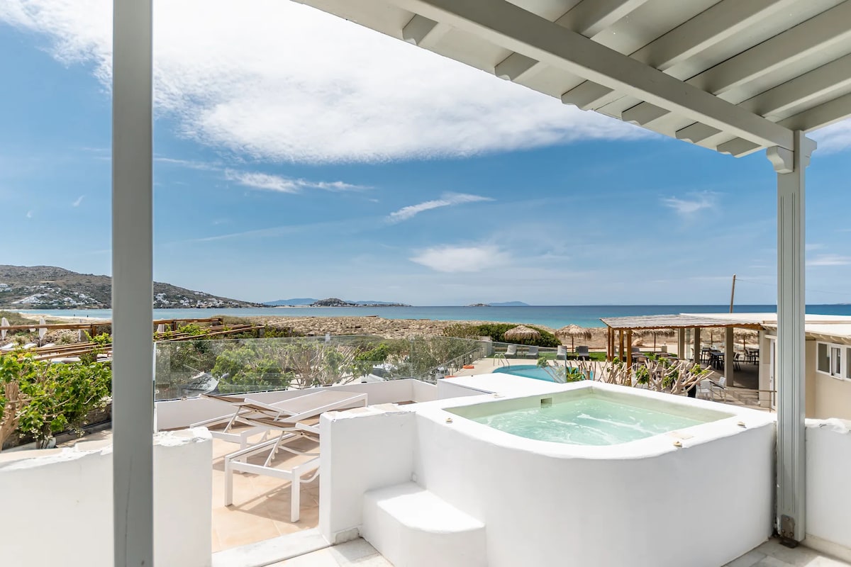✨ The Deluxe Sea View Suite with Private Jacuzzi is part of Golden Sand Hotel, located directly on Plaka Beach. It combines elegance and pure relaxation, featuring a private jacuzzi and stunning Aegean views, while guests enjoy access to the shared swimming pool with a snack bar, as well as complimentary sun loungers and umbrellas at the private beach. The experience is completed with daily breakfast, creating the ideal setting for a premium seaside stay.