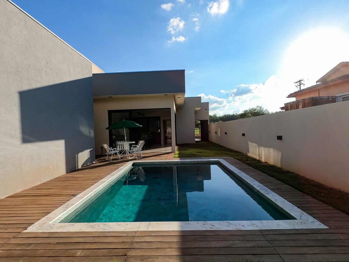 Naš umik je v letovišču Thermas de Santa Barbara Resort. Stanovanje z varnostjo, infrastrukturo in mirom, ki si ga zaslužita vaša družina in vaš hišni ljubljenček. Prostorna in udobna hiša s 4 spalnicami, vse s klimatsko napravo, bazenom (neogrevan), gurmanskim prostorom, dnevno sobo s kaminom, zunanjim salonom, prižganim ognjem, garažo, straniščem, domačo pisarno in Wi-Fi-jem ter popolnoma obzidanim dvoriščem. Letovišče ima tržnico, restavracije, klube, spa, jezera za ribolov in stoje, poti in veliko zelenja.
