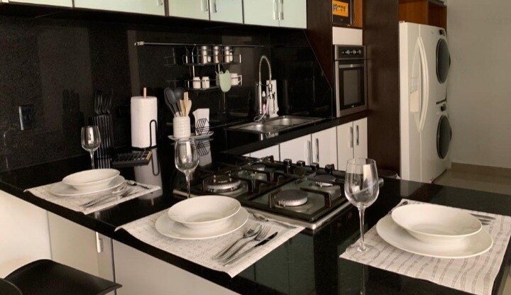 Kot stanovanje v privilegiranem objektu. Vključuje: posteljo z rjuho, pisalno mizo, klimatsko napravo, Wi-Fi, TV z Netflixom, pralni/sušilni stroj, popolnoma opremljeno kuhinjo, brisače in toaletne potrebščine, likalnik za oblačila, sušilnik za lase. Lastnosti območja: Stavba s 100-odstotnim nadstropjem, vodo non stop in pokritim parkirnim mestom. Dva nakupovalna središča s supermarketi, sejem hrane in Farmatodo sta 1 ulico stran. Enostaven dostop do različnih predelov mesta in avtoceste
