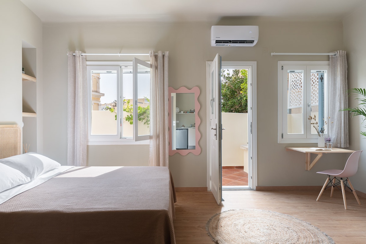 Wake up in this charming, contemporary bright apartment located in the heart of Ermoupolis. This newly renovated, luxurious flat is well-equipped and situated in the vibrant center of Ermoupolis, Syros. Just 100 meters from amazing restaurants, cafes, and bars, it’s also a short walk from Miaouli Square, the Ermoupolis harbor, and the waterfront.