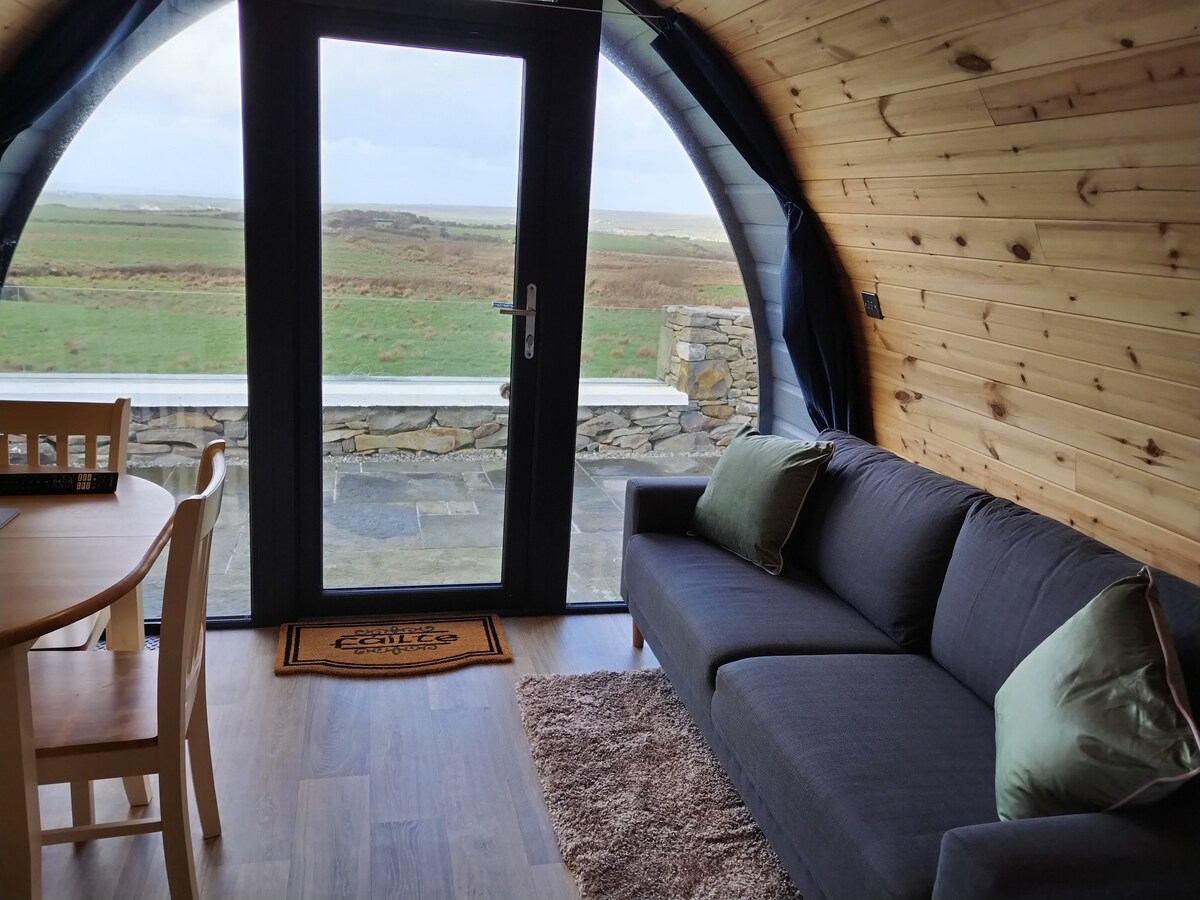 Uživajte v zvoku morja, ko bivate v tem edinstvenem bivališču. Pogled na Atlantski ocean, Aranske otoke in goro Connemara. Seaview Glamping pod je odlično izhodišče za raziskovanje veličastnih pečin Moher, sprehoda po pečinah, divjih lepot burrena in očarljivega otoka Aran. Mesto Galway je oddaljeno le eno uro vožnje. Pustolovščina je vedno na dosegu roke.