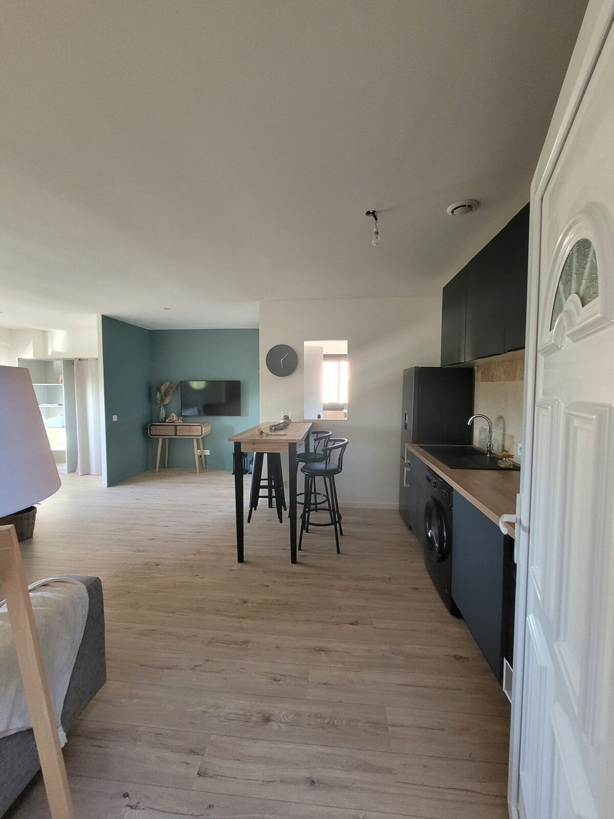 Le loft design indépendant de 100 M2 s’ouvre sur un grand espace de vie composé d’un salon, d’une cuisine ouverte et salle de bains au rez-de -chaussée et d’une mezzanine à l’étage. Le salon possède un grand canapé en cuir , un fauteuil et une télévision écran plat. La cuisine ouverte est entièrement équipée avec îlot central. La salle de bain est dotée d'une douche à l’italienne, double vasque, machine à laver et WC. Les deux chambres disposent d' un lit en 160 et d'une penderie.