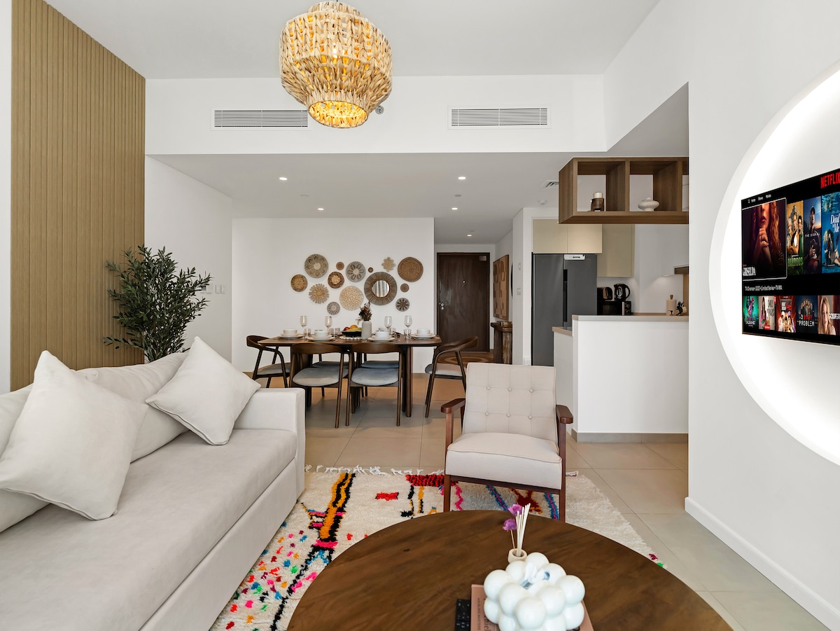 Elegantno opremljeno stanovanje v Port de La Mer združuje sodobno zasnovo z udobnim bivalnim udobjem. Uživajte v čudovitem razgledu na morje, visokokakovostni opremi in ekskluzivni lokaciji tik ob obali. Idealno za tiste, ki želijo izkusiti Dubaj v slogu. Upoštevajte, da se v bližini pojavljajo novi projekti – podnevi lahko pride do hrupa pri gradnji. Vendar edinstvena lokacija plaže in udobje našega stanovanja ostaneta nedotaknjena.