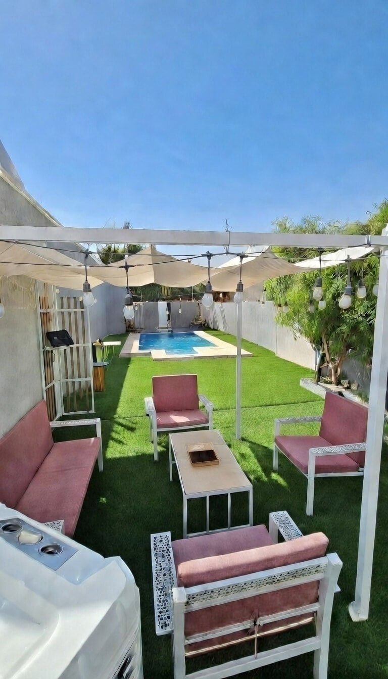 You won’t forget the peacef Al Dhaid Farm A special destination for family gatherings and private events. The farm is fully equipped and offers a beautiful, spacious atmosphere for comfort, relaxation, and enjoyment. 🛏 Bedrooms The farm features 5 spacious bedrooms, each with 4 beds, with additional space for 4 more guests on floor mattresses. Main Hall A very large main hall with 3 comfortable seating areas, a coffee bar, and two marble dining tables that can accommodate up to 20 guests.