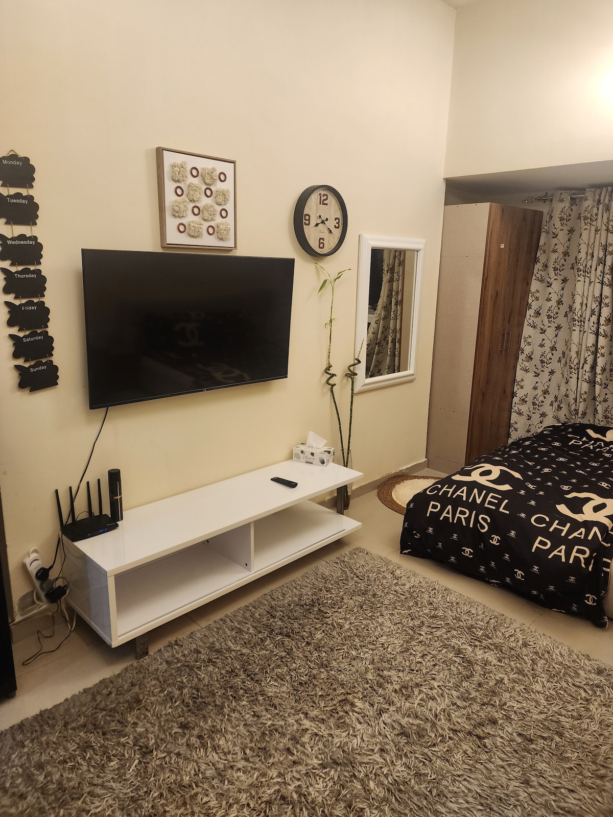 Čudovito stanovanje s kopalnico, balkonom in dvema kopalnicama, skupno dnevno sobo in kuhinjo. Centralna klimatska naprava Ikea postelja in vzmetnica Nočna mizica Mobilni polnilnik in svetilka Almirah ter toaletna mizica Na voljo so 3 enojne dodatne vzmetnice Stol za izvršne direktorje na delovni mizi Popolnoma higieno in čisto Kavč in 65-palčnatelevizija z Netflixom, Amazon Prime Video in 200 TV kanalov Brezplačni Wi-Fi Pečica, štedilnik, mešalnik za sok, opekač kruha Pralni stroj
