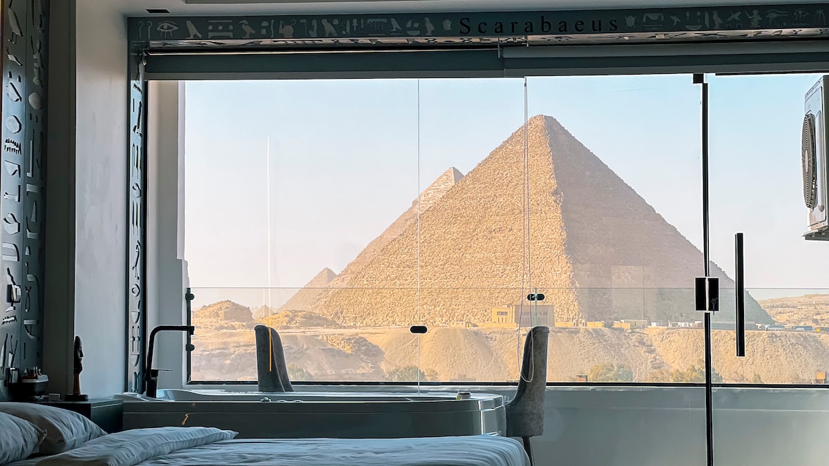 Welcome to our charming 1-bedroom in Giza, where you can enjoy spectacular views of the Great Pyramids right from your private balcony. Featuring a cozy bed and an attached bathroom, this space is perfect for relaxation after a day of exploration. Located just a 5-minute drive from the Giza Pyramids and the Grand Egyptian Museum, our apartment is also within walking distance to delightful restaurants, cafes, and supermarkets. Enjoy a complimentary breakfast on our rooftop cafe.
