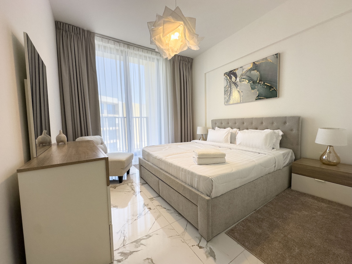 Svetlo in elegantno obalno zatočišče v Mina Al Arab! Idealno za pare, družine in delavce na daljavo. Kaj vam bo všeč: • Sončen odprt bivalni prostor s pametno televizijo in Netflixom • udobna zakonska postelja in raztegljiv kavč za 3–4 goste • Popolnoma opremljena kuhinja (vključno z aparatom za kavo ☕) • Hitra povezava Wi-Fi – idealna za delo na daljavo • Tiha in družinam prijazna skupnost • samostojni vstop za enostaven prihod Sprostite se, delajte ali raziskujte – udobje in obalni utrip na enem mestu 🌊✨