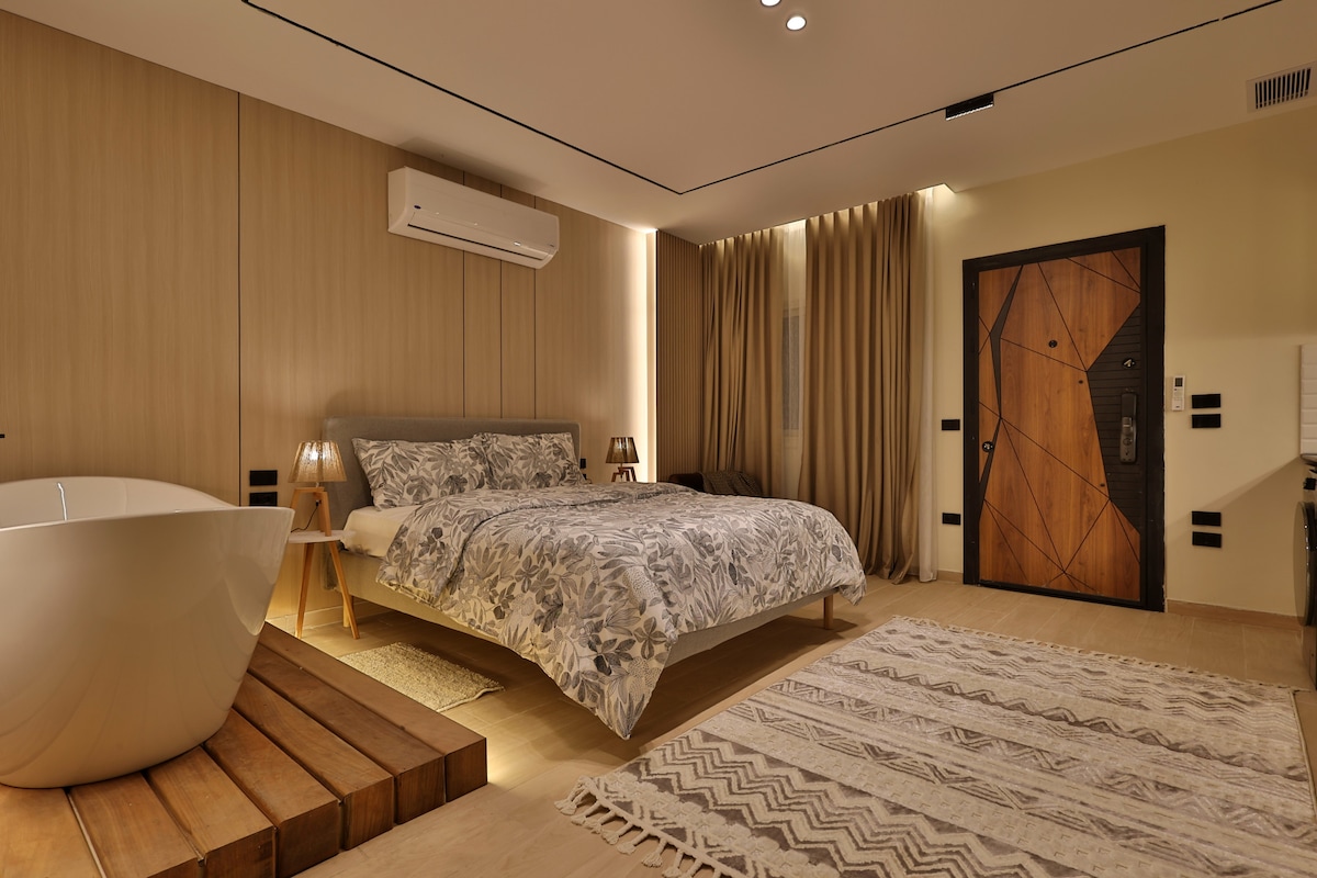 Luxury studio with a modern design and a relaxing atmosphere, located in a quiet area in Nasr City near City Stars Mall. Features a private freestanding bathtub with hot water and shower, orthopedic mattresses for ultimate comfort, a fully equipped kitchen, and high-speed fiber Wi-Fi. Perfect for couples, solo travelers, and business guests looking for a clean, cozy, private, and peaceful stay close to the airport and main attractions.