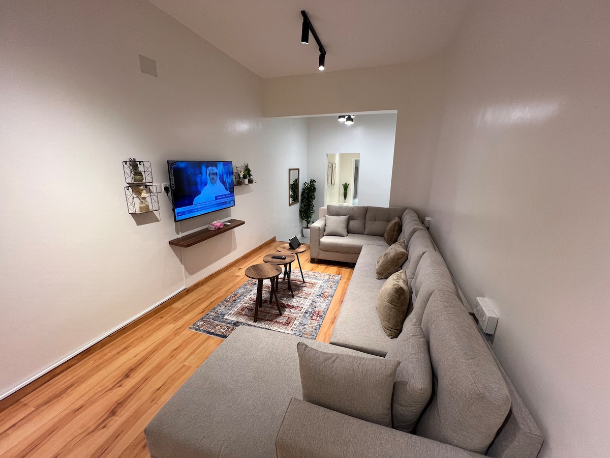 شقة واسعة بمساحة 115 م² تضم صالة مريحة، غرفة نوم ماستر وغرفة بسريرين مزدوجين، دورتين مياه (عربية وأوروبية)، بلكونة، ومطبخ مجهز تجهيزًا أساسيًا، إنترنت سريع، تلفزيون، تكييف، غسالة ملابس، بالإضافة إلى مصعد ومواقف سيارات، . Spacious 115 sqm apartment featuring a comfortable living area, master bedroom and a bedroom with two double beds, two bathrooms (Arabic & European style),balcony, basically equipped kitchen, high-speed internet, TV, air conditioning, washing machine, elevator, parking, and a .