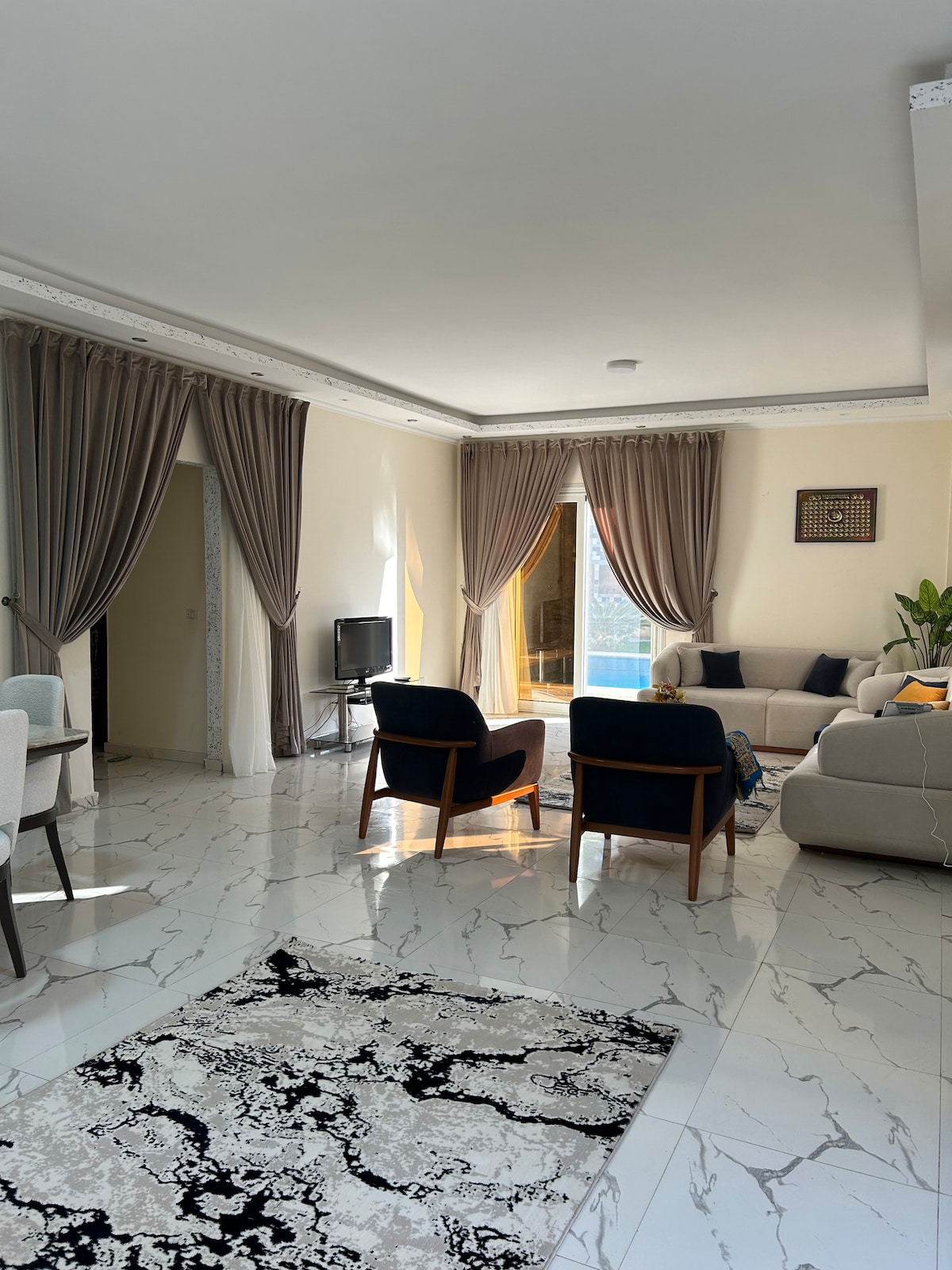 Zasebno bivališče, primerno za družine, ženske, ki nosijo hidžab, in skromne ženske, ki iščejo POPOLNO zasebnost, z dvema velikima bazenoma. Prvi je globok 2,5 m, drugi pa je primeren in varen za otroke. Prostoren velik vrt z visokimi drevesi, ki zagotavljajo popolno zasebnost ob bazenih in na vrtu. Notranje pokrito parkirišče zagotavlja varnost avtomobilov mojih gostov in jih ščiti pred soncem. Neverjeten standard čiščenja za notranjo in zunanjo namestitev. Bazeni in vrt se redno vzdržujejo med bivanjem gostov.
