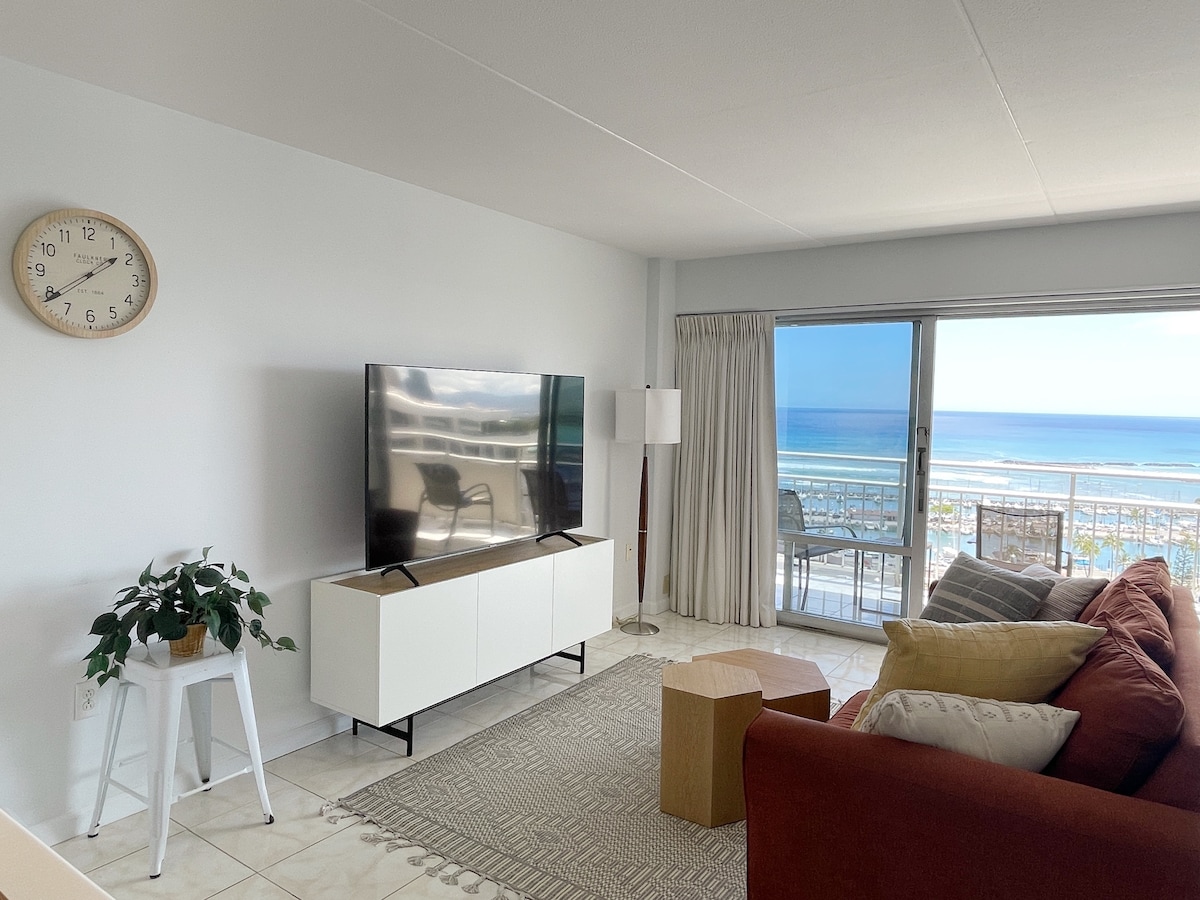 Sodoben studio s pogledom na ocean iz sredine stoletja z velikim zasebnim lanaijem. Lanai (balkon) ima vrtno pohištvo z vtičnico za delo in počitek. Posodobljena kuhinja z granitnimi pulti, razdeljeno klimatsko napravo in hitrim omrežjem Wi-Fi. Popolnoma nova zakonska postelja, neobvezen razdelilnik sobe s kavčem/zakonsko posteljo. Oprema letovišča Ilikai vključuje dva bazena, pešpot do plaže Waikiki in družinam prijazno laguno ter restavracije in trgovine. Storitev parkiranja na kraju samem ali plačljive možnosti parkiranja v bližini.