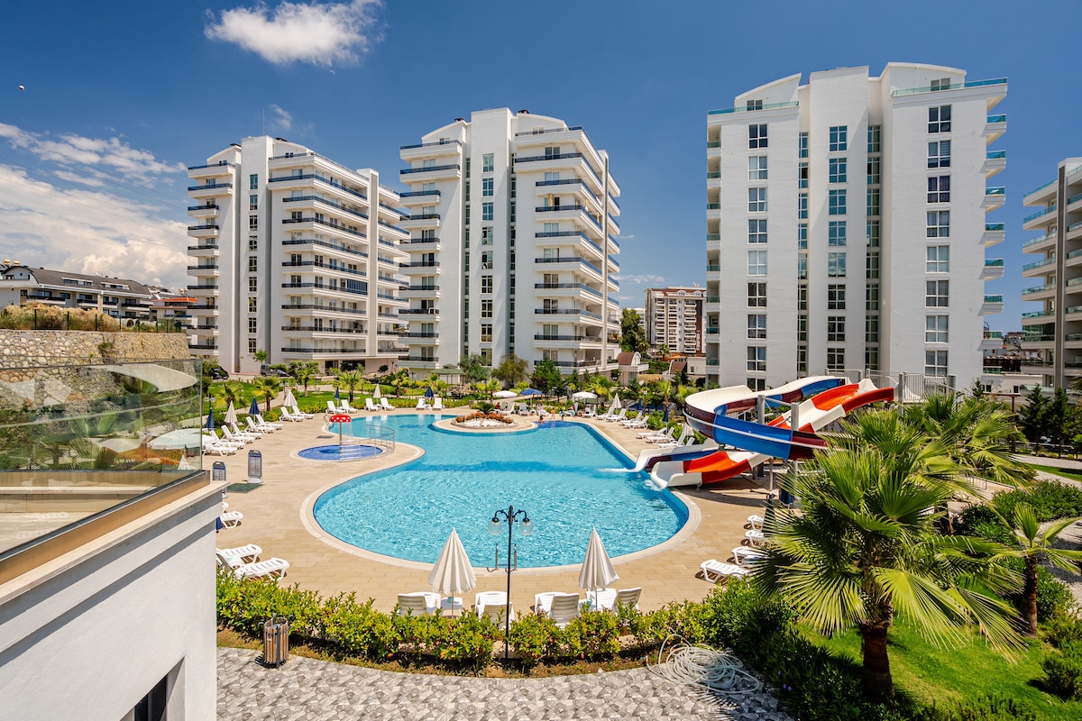 Lovely Beachfront 1 +1 Apt. Lexus Residence (70 m2) Nova oprema, dostop do plaže in pogled na morje. Celotne sezonske dejavnosti z velikim balkonom, kjer lahko uživate v jutranji kavi in obrokih Samostojni vstop v pametni ključ 7 km do centra in 35 km do Gazipase Glede na sezono velik notranji in zunanji bazen, fitnes, vodni tobogan, teniško igrišče, igralnica, kino salon, otroška igralnica. Soba za zabave, prostor za žar in varnost 7/24 (turška kopalnica, savna odprta ob vikendih) Najbolj uživajo pari in družine.