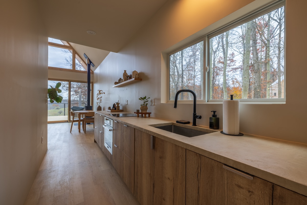 This is a rural location. Located on an open hill along a private drive, this newly built -"little house on the prairie"- is surrounded by fields on one end and woods on the other. The moon and lotsa stars at night -no neighbors nearby. Trails and ponds are available for your enjoyment. Swimming* and fishing is encouraged in the warmer months. A small outdoor fire ring is nearby. Hiking in the woods on the far side of the field will be off limits last week of October through thanksgiving.