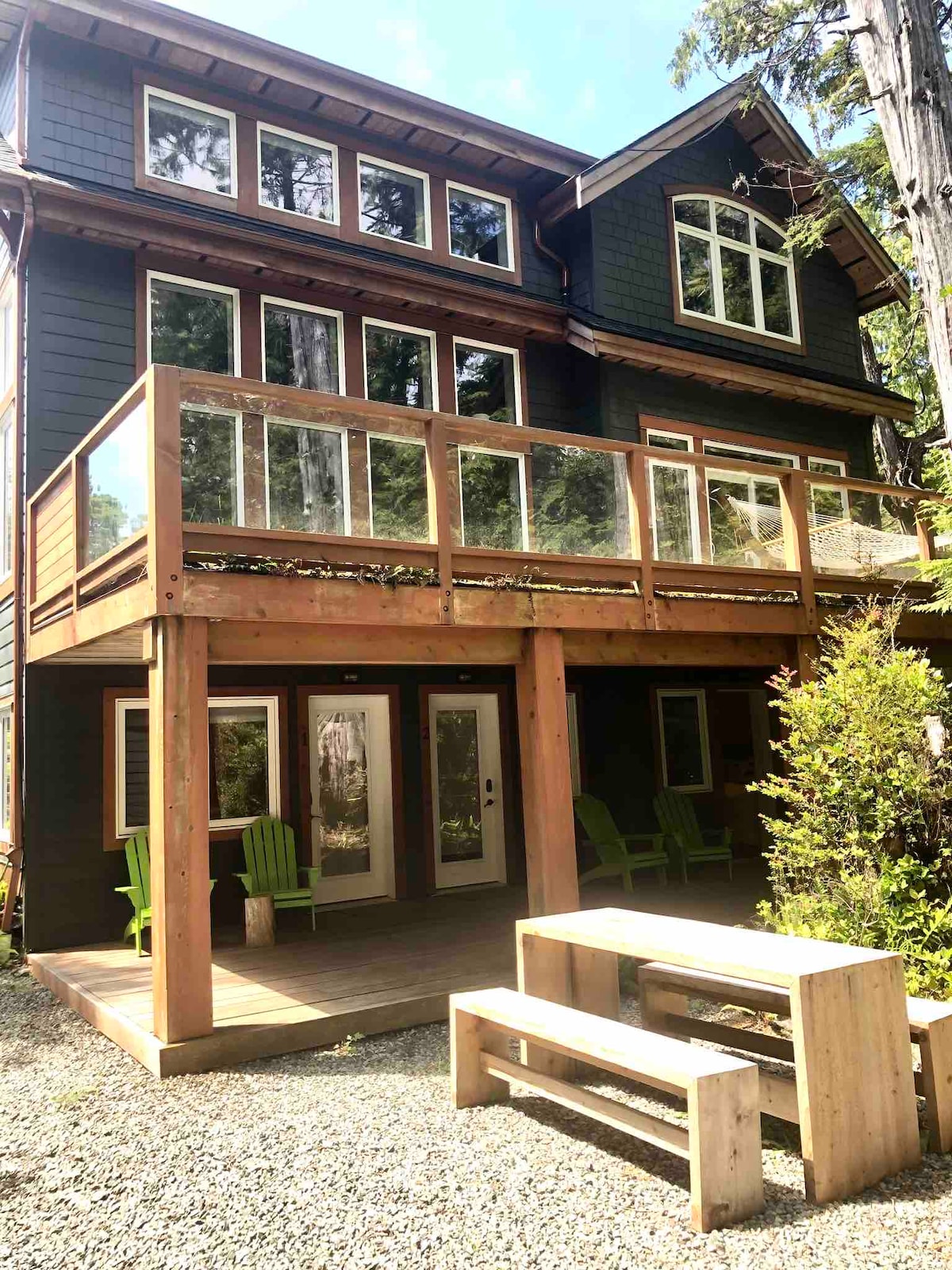 Priljubljeno za pare in majhne družine. Zasebna suita v pritličju je kot nalašč za 1 ali 2 odrasla, vendar lahko spi 3 osebe. Majhna kuhinja, kopalnica, enojna postelja/kavč in sosednja spalnica z zakonsko posteljo. Žar, terasa, masažna kad in suha/parna savna na drva in zunanja prha. Polnilnik za električna vozila 12,5 kw/h. Dog friendly for 2 small dogs/1 medium dog *pls inform when booking. Deskajte in se sprehodite po plažah in divjih pacifiških poteh, ki so le nekaj minut stran od vaših vrat DOU Licence#00006794, BC STRR Regn #H348680415 Max Occup. 4.