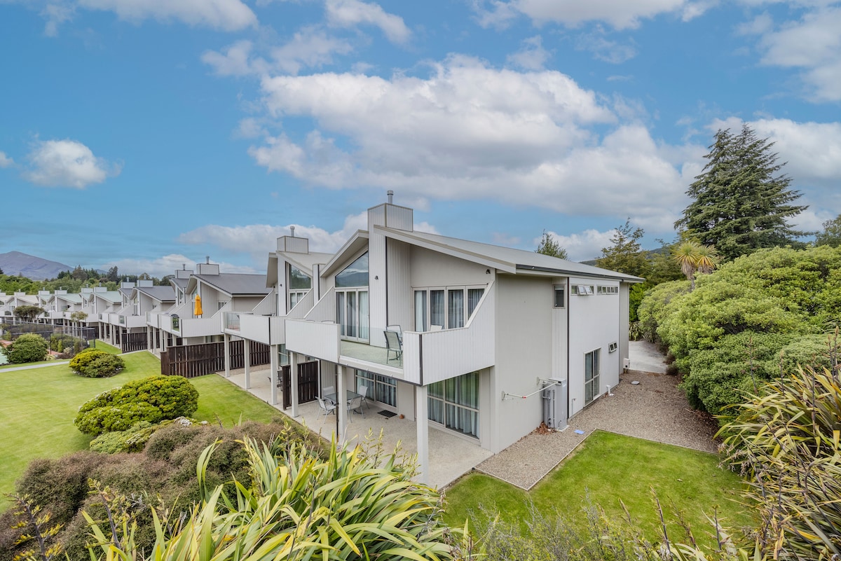 Ta čudovita vrstna hiša v letovišču Wānaka je idealna za 4 prijatelje ali družino. 2 spalnici (1 zakonska postelja in 2 veliki enojni vzmetnici s sanjsko peno in žepnimi vzmeti za popoln spanec), popolnoma opremljena kuhinja, toplotna črpalka/klimatska naprava, ogrevana kopalnica, slastni kavči, ročno izbrana umetniška dela. Pogled na gore in vrt, spa, bazen, tenis, savna, telovadnica - neverjeten paket! Poskrbite za nepozabno potovanje s tem izjemno opremljenim stanovanjem - le kratek skok iz mesta. Zagotovite popolno bivanje skozi vse leto.