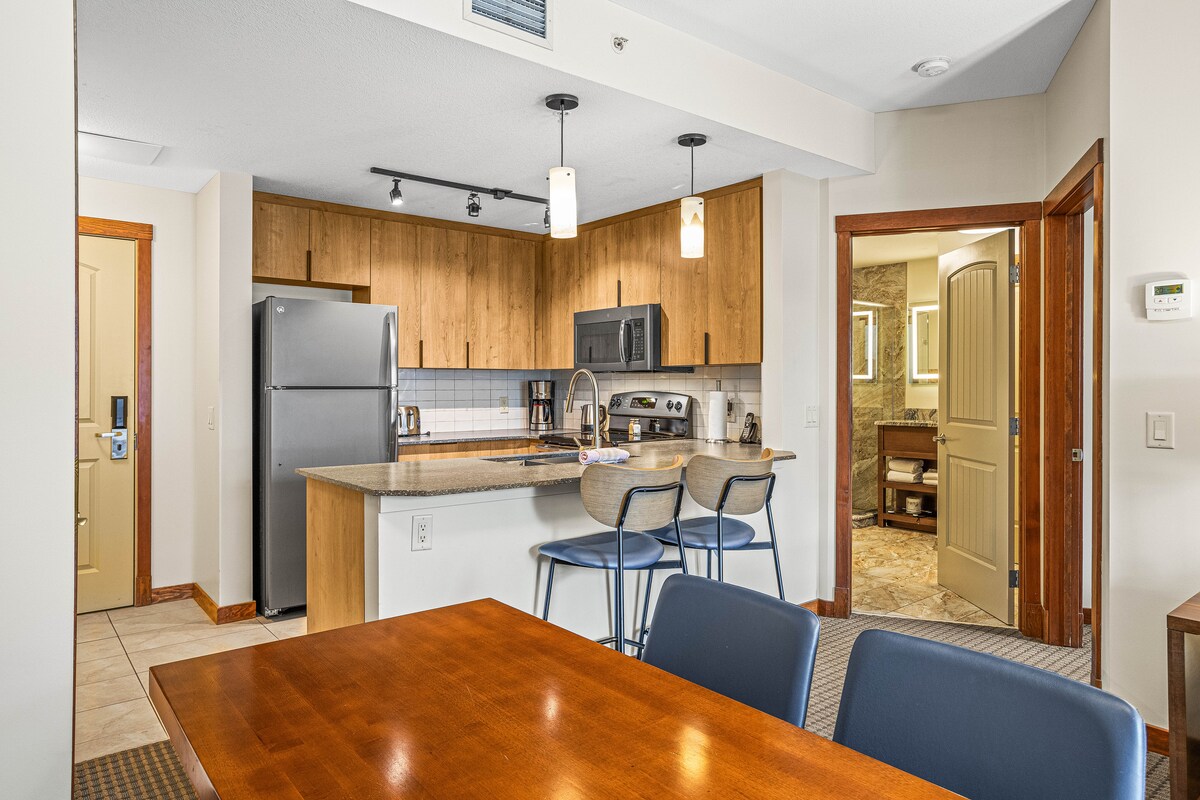 Vaša pustolovščina v Skalnem gorovju se začne v slogu v tem čudovitem enosobnem penthouse stanovanju v Rundle Cliffs Lodge, Spring Creek Mountain Village. Visoki stropi katedrale z osupljivim razgledom, ki uokvirja prostoren dnevni prostor in čudovit kamniti kamin. Pripravite nevihto v brezhibni kuhinji. Sprostite se v ogromni kopalnici ali pa se stisnite v luksuzno 5* hotelsko posteljnino v spalnici z zakonsko posteljo. Vse le nekaj korakov se sprehodite po slikoviti promenadi do restavracij, barov, kavarn in nakupov v središču Canmoreja.