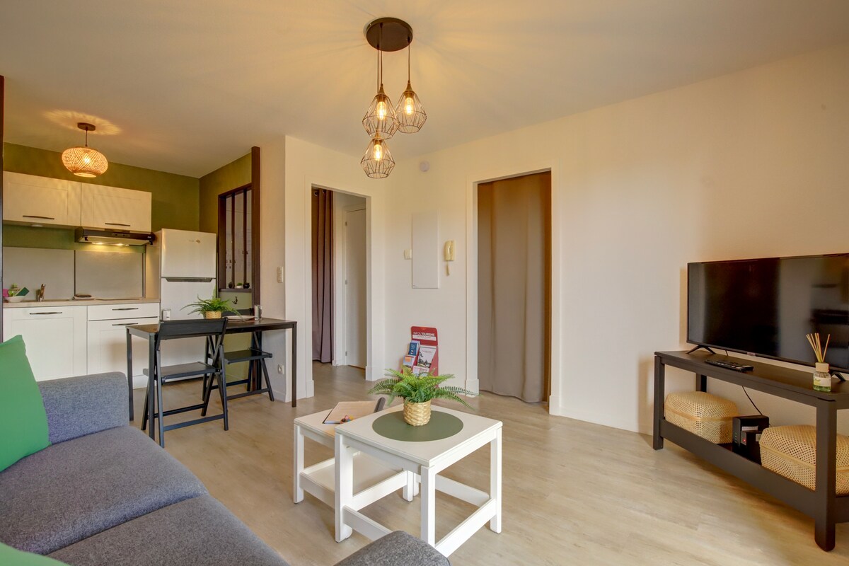 Opremljena garsonjera v središču mesta Carmaux, Prenovljeno in odmaknjeno. Dobro opremljeno stanovanje. Kuhinjski prostor z indukcijsko kuhalno ploščo, kombinirano pečico (izdelana tradicionalna pečica + mikrovalovna pečica), aparatom za kavo in shrambo. Kopalnica s pralnim strojem. Spalnica(zakonska postelja), kavna mizica, jedilna miza, TV in internet. Police. Stojalo za oblačila je na voljo. Poletni sončni kolektorji s samopostrežno porabo podnevi. Terasa z jedilno mizo
