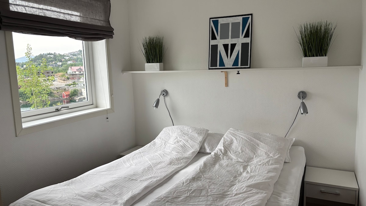 Finn roen, nyt utsikten og sov godt i moderne og komfortabel leilighet med egen terrasse. Rolig villastrøk. Bare 100 meter fra sjøen og storslått utsikt fra både leilighet og terrasse. Behagelig gulvvarme, godt og varmt. Gratis parkering og el-bil lading. Ålesund sentrum 20 min med bil. Dagligvarebutikker ca 1 km, og kjøpesenter (Moa Amfi) ca 8 km. En god base for dagsturer i området slik at ferien blir en rekreasjon. Nærområdet har flotte naturopplevelser å by på.