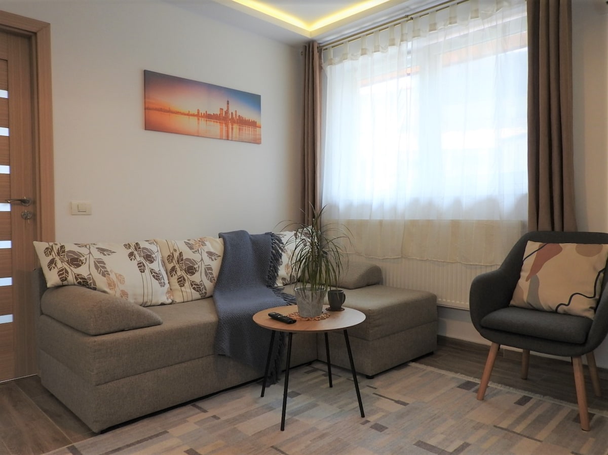 - Brezplačno parkiranje v sklopu prenočišča. - 85 m2, s klimatsko napravo v vsaki sobi. - Prostorna 2 spalnici za 4 goste. - Dnevna soba z raztegljivim kavčem za dodatna 2 gosta. - 1,5 kopalnice - Sodobna oprema, vključno s televizorjem, pisalno mizo, aparatom za kavo in še marsikaj. - Balkon s očarljivim razgledom na mesto. - Idealna lokacija v središču mesta, v bližini znamenitosti, kot so Centralni park, Union Square, staro mestno jedro, botanični vrt, muzeji, restavracije, pivnice, univerza Babes-Bolyai in še veliko več.