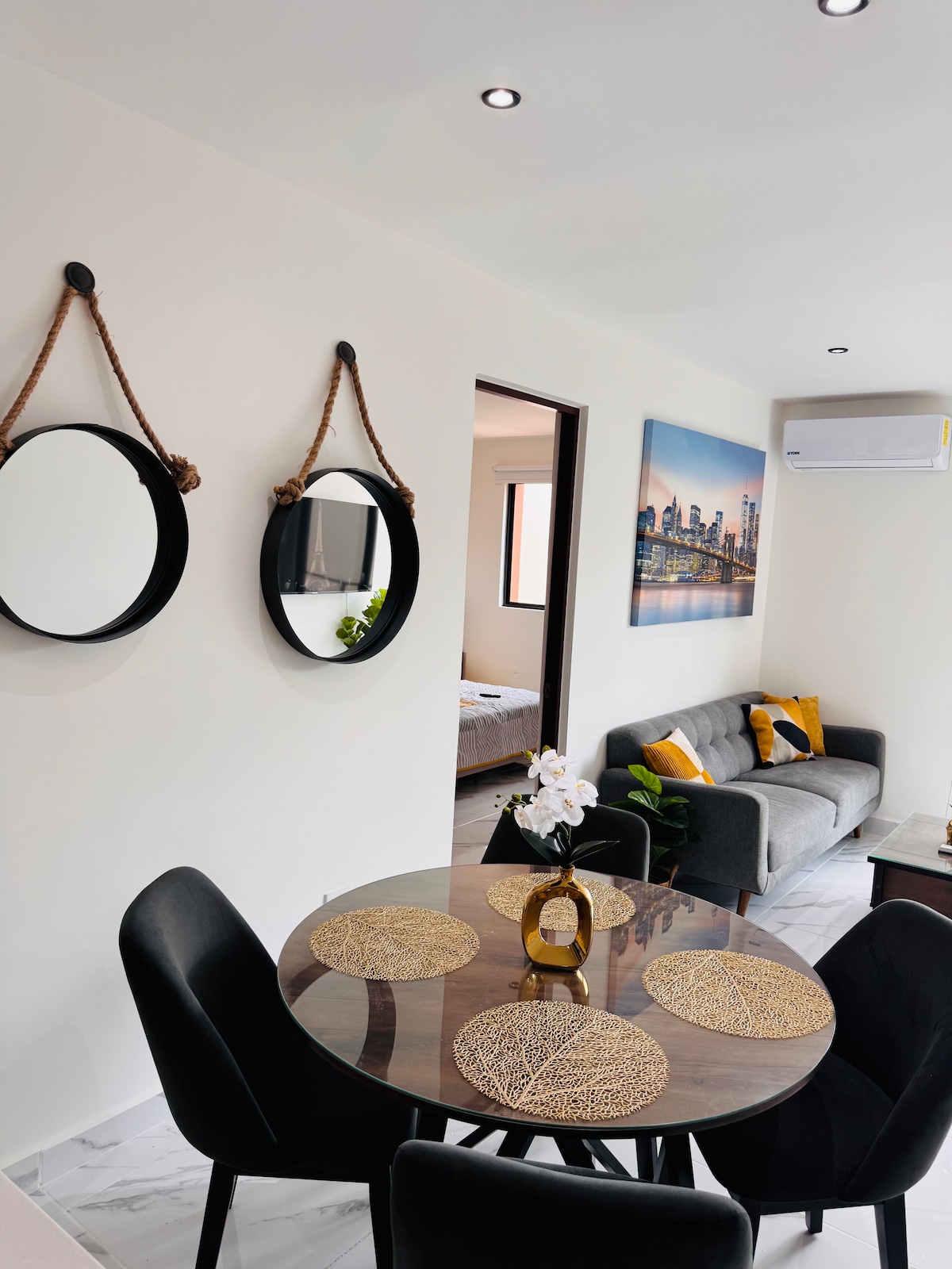 Beautiful new apartment, super comfortable and modern with a pool and excellent family amenities within a gated community with 24/7 security, just 20 minutes from the airport and the best beaches in the Mexican Caribbean. Supermarkets, pharmacies and self-service stores at 5 min. Come to rest without worries! It includes: Wifi 2 rooms with queen size bed and air conditioners 1 sofa bed Living room with air conditioning 1 full bathroom Kitchen fully equiped Laundry center Beach towels