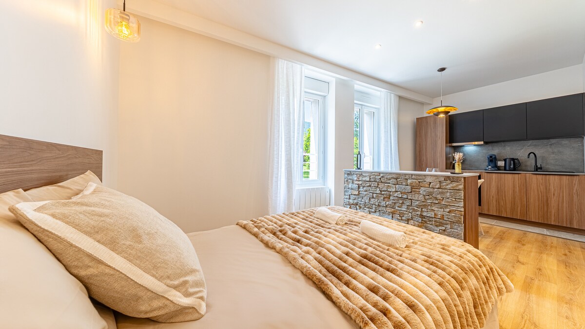 Čudovit nov in udoben studio, ki se nahaja v pritličju, v osrčju središča mesta Allevard. Toplo vzdušje in sodoben dizajn! Ta nepremičninski dragulj je popolnoma primeren za potrebe parov ali radovedov v iskanju sprostitve in dobrega počutja. Uživajte v privilegirani lokaciji, v bližini termalnih kopalnic, živahnega trga in brezplačnega parkiranja v razdalji 50 metrov. Vse udobje, popolnoma opremljeno z novimi napravami, pralnim strojem in udobno posteljo velikosti 160 cm!