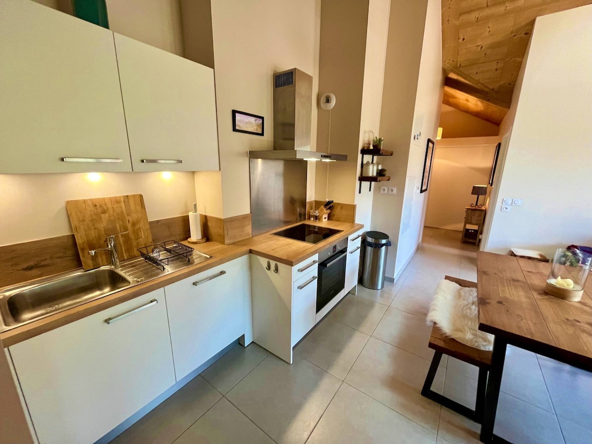 Magnifique appartement entièrement rénové en 2021, dans un style «chalet de montagne » pour 6 personnes avec une vue imprenable orientation plein sud. Situé dans le vieil Alpe, dans une résidence paisible. Il est composé d’1 chambre adulte vue plein sud, d’1 coin montagne avec 2 lits superposés , d’1 cuisine entièrement équipée, d’1 salle de bain avec douche & WC, rangements. Equipé d'1 lave/sèche linge Le salon dispose d'1 canapé lit + TV Casier à skis dédié, à l'entrée de l'immeuble