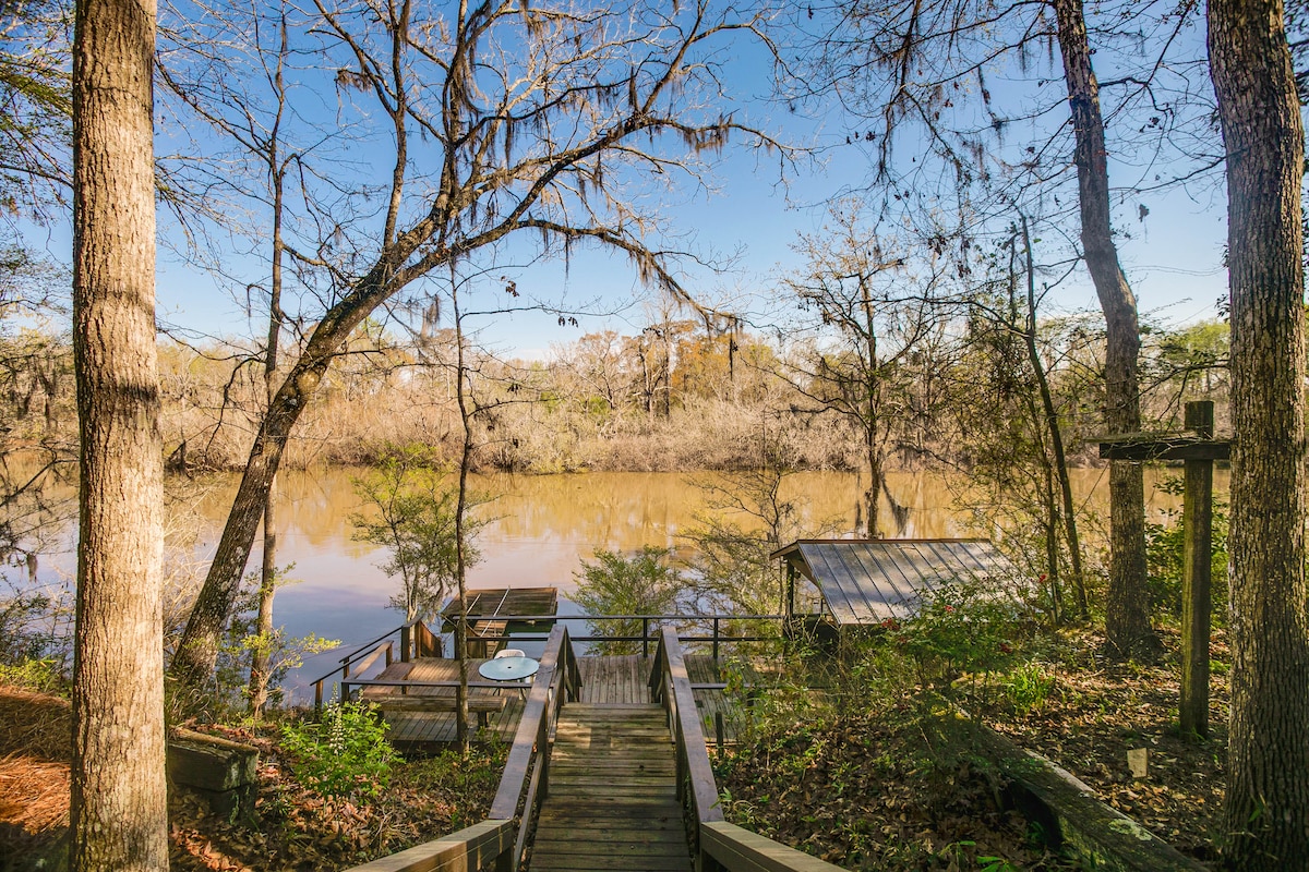 Želite raziskati obalno Gruzijo? Potrebujete miren kraj za odklop, sprostitev in polnjenje? Ta rustikalna koča ponuja razkošje in opremo ter je kot nalašč za romantičen oddih ali vikend pustolovščino. Nahaja se na 9 slikovitih hektarjih, ki ponujajo drevesa, v katerih se nahajajo sove, visoke pečine, ki se razteza do dolge promenade, ki vas popelje skozi Cypress gozd, ki se konča ob reki Satilla. Na reki se lahko sprostite, opazujete naravo ali berete knjigo. Smo hitra vožnja do odličnega ribolova.