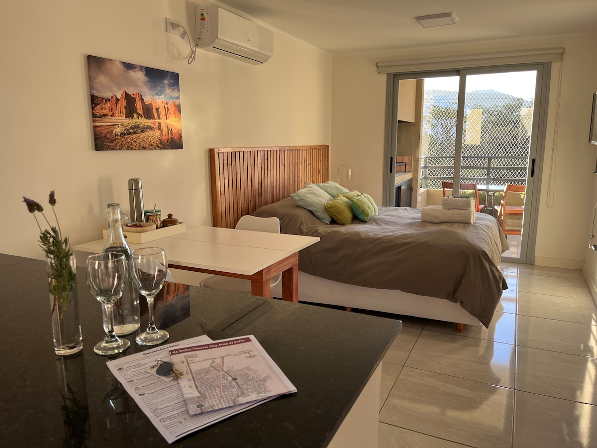 Disfruta de Salta la Linda en un alojamiento con todas las comodidades. Amplio monoambiente (studio) con balcón aterrazado, rodeado de verde. Ubicación inmejorable: zona tranquila a solo unos pasos de diversos puntos de interés. Cama Queen (opción dos individuales) + sillón cama. Contamos con cocina de inducción, cafetera Nespresso, lavarropas, smart TV, secador de pelo.