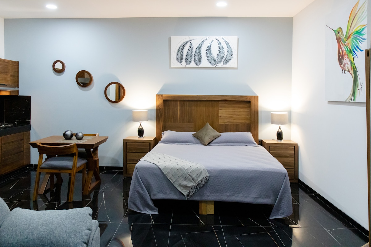 Studio 51 je idealen prostor za bivanje v El Arenalu »World Heritage Site« zaradi modre pokrajine, dežele tekile. Strateško se nahaja z ločenim vhodom, širokimi ulicami, ki vam omogočajo, da parkirate brez težav. Ima ločeno stranišče in prho, da povečate njegovo uporabo, 1 zakonsko posteljo, 1 raztegljiv kavč, omaro z prtljažnikom, opremljeno majhno kuhinjo, pametno televizijo, jedilnico s šahovskim kompletom, lokalno bibliografijo, slikovno razstavo in vedno z dobro kavo.