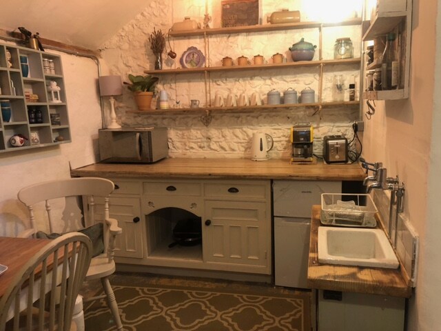 Enjoy autonomy at this unique and tranquil getaway. The Shed is a self-contained annex with its own pathway and entrance. Outside is a secluded seating/breakfast area. On entering you'll find a shower room with heated towel rail and electric shower, dining space for two and a kitchenette. Through a sliding door is a kingsize bed, love-seat, TV with google chrome, books, drawers, somewhere to hang clothes. (To access streaming services, please bring your own account information.)