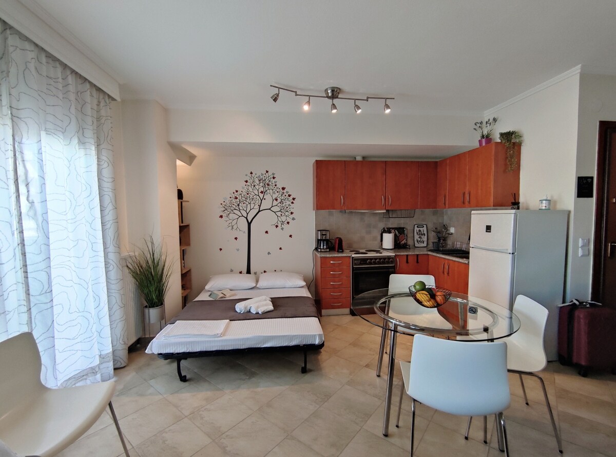 Popolnoma nova garsonjera s sodobno dekoracijo z edinstveno zakonsko posteljo (Queen) in prepletenimi lažnimi stropnimi oblikovami (38 m²). Garsonjera se nahaja v središču mesta in je oddaljena manj kot 10 minut od letališča ter številnih nakupovalnih središč. S 3-minutnim sprehodom si lahko ogledate mestni trg, v 10 urah pa lahko obiščete jezu Thermi. Če želite plavati, lahko obiščete Halkidiki v 30 minutah.