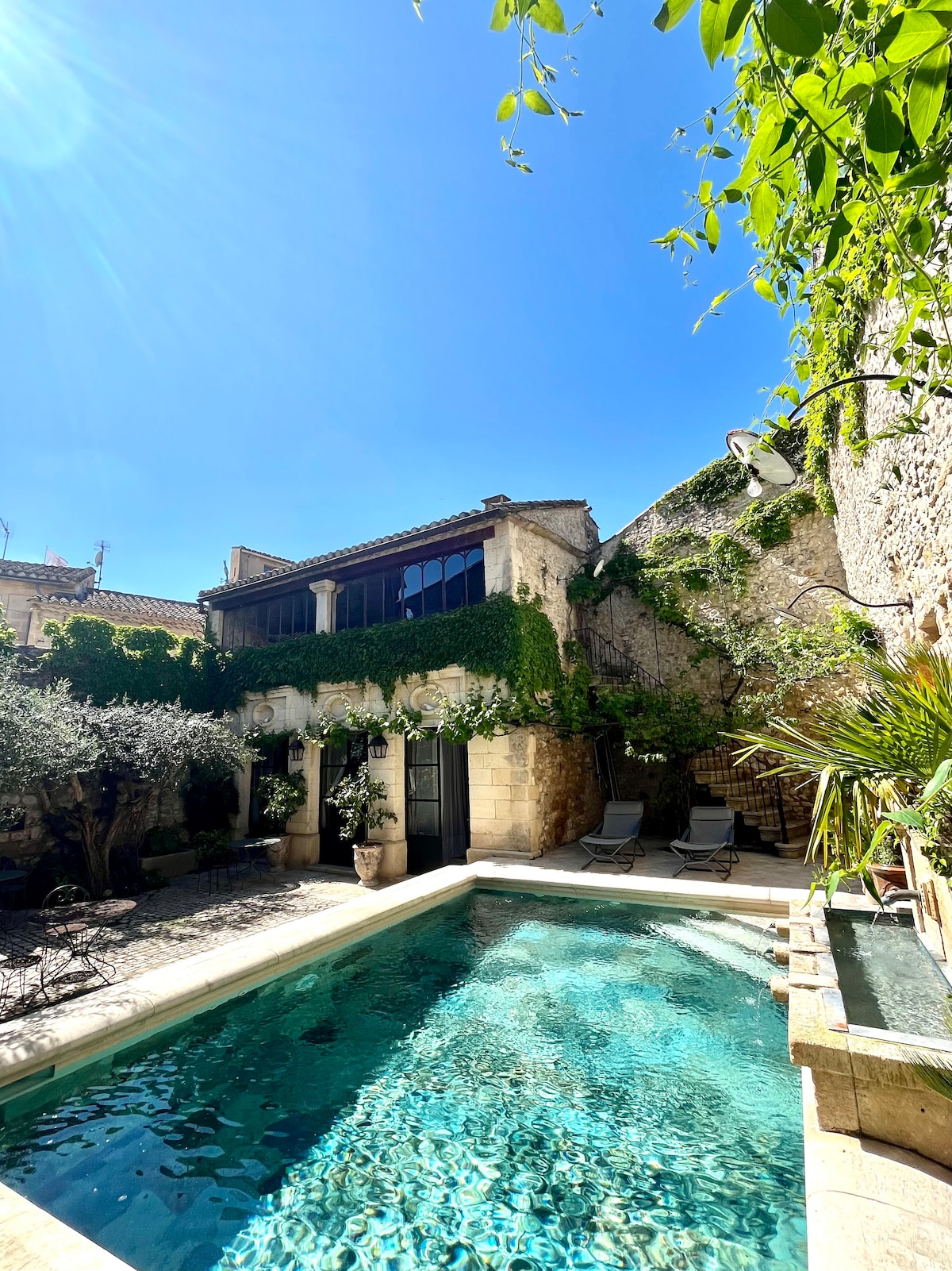 Mas en pierre avec piscine XXL chauffée – calme absolu à Nîmes. Le sud dans un authentique mas en pierre, niché au cœur d’un parc de 6000 m² d’oliviers et de chênes. Une piscine XXL chauffée, Une salle d’été de 80 m2 vitrée ouverte sur la nature et la piscine. Le mas offre 3 chambres dont 2 suites parentales, 2 cuisines équipées (intérieure et d’été), 2 salons, 2 salles à manger, un espace musique et un billard. Charme, confort et sérénité pour des vacances inoubliables à la campagne.
