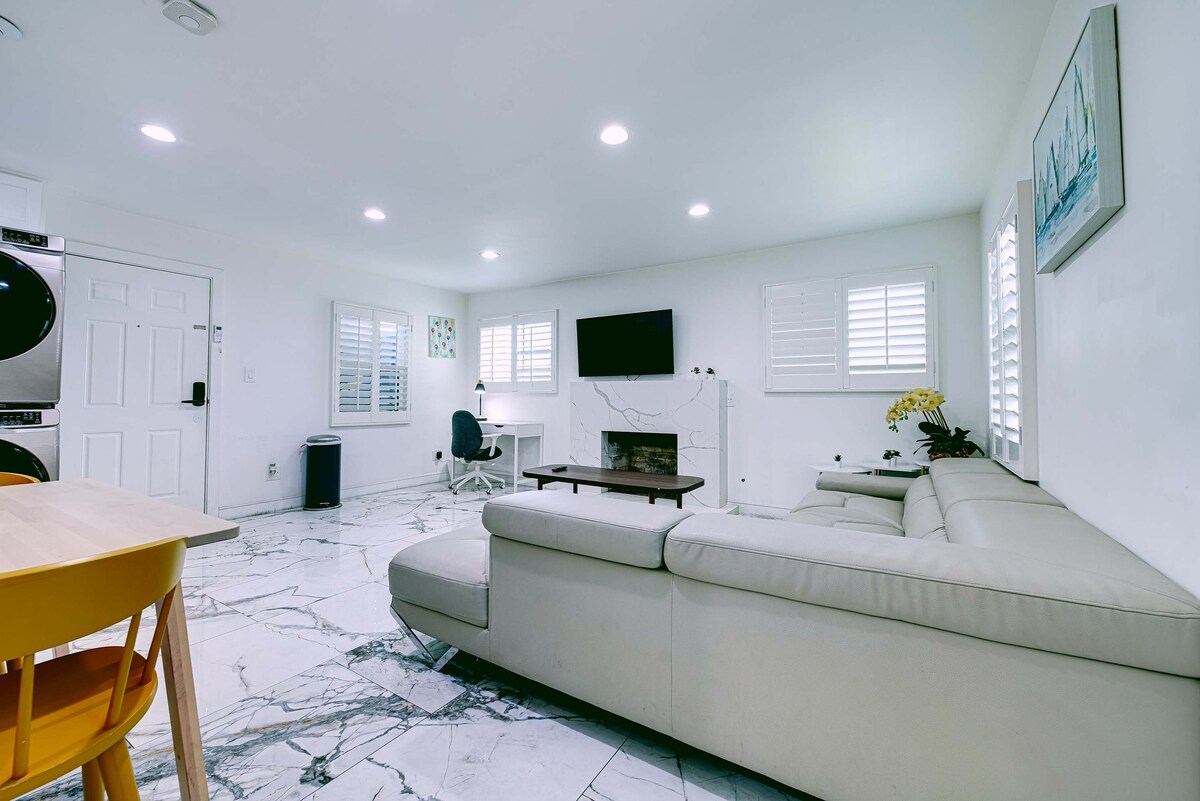 Približno 650 kvadratnih čevljev Garsonjera. Udobna zakonska postelja. Udobno spi 2 osebi, po lastni presoji za tretjega gosta. Veliko prostora v omari. Pametni televizor, da se lahko prijavite v svoje najljubše televizijske aplikacije. Kavč, klubska mizica in predalnik v odprti spalnici/dnevni sobi. Popolnoma opremljena kuhinja. Hitra povezava Wi-Fi. V enoti je pralni/sušilni stroj (detergent). Hladilnik z ledomatom. Stekleni grelnik vode (instant kava). Popolnoma razkuženo in čisto. To ni skupni prostor. Uživajte