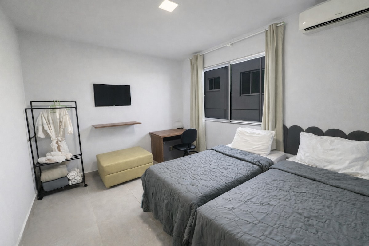 Apartamento novo de 1/4 no Gran Life Medical Complex, no centro de Anápolis, GO. Acomoda até 3 hóspedes. Tem 1 suíte com cama de casal, ar condicionado e guarda-roupa. Sala com sofá-cama, cozinha completa (microondas, forno elétrico, filtro, geladeira, fogão, liquidificador, cafeteira elétrica), banheiro social e espaço de trabalho. Condomínio com piscina, academia, área infantil e vaga de garagem. Vista linda e localização privilegiada, perto de tudo. Conforto e praticidade em um só lugar !