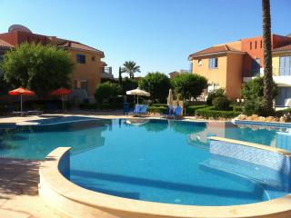 Enjoy your holidays!! It is a very well-kept and quiet holiday complex near Paphos with a large pool area, baby pool and modern facilities. The beach with crystal clear water is only 800 m away. The city of Paphos can be reached by bus (approx. 15 minutes). Other attractions such as Aphrodite Hills are nearby. Ideal for golfers, as there are 3 international golf courses in the immediate vicinity (approx. 10 minutes by car). Near the airport (approx. 15 minutes).