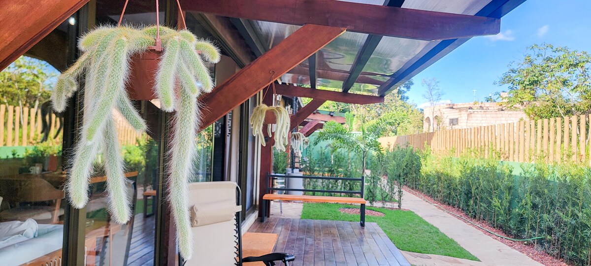 Sprostite se v tem mirnem in elegantnem prostoru. Hiša ima prostorno spalnico z razpoložljivostjo dodatnega ležišča. Ima balkon s kavčem, ki ustreza družini, pogled na gozd in opremljeno kuhinjo. Kopalnica z vsem novim in optimalno kakovostjo. Vsi razmišljajo za udobje tistih, ki prispejo. Visok strop zagotavlja hladnejše vzdušje, vendar nudimo tudi 2 ventilatorja in TV z Netflixom. Hiša se nahaja v vasi Manna Lar Village, zato si boste lahko izmenjali vprašanja in prosili za informacije.
