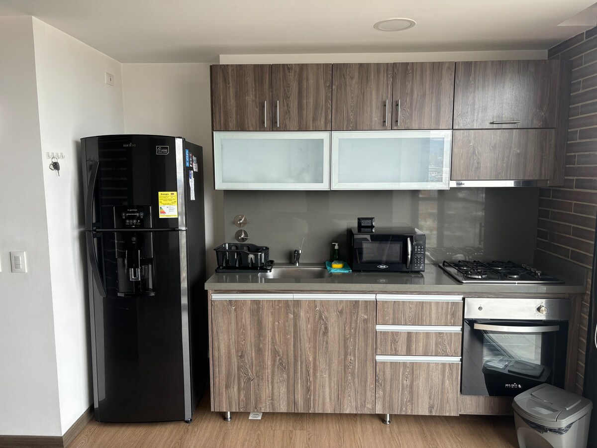 🌆 This accommodation is located in Quinta Camacho, a bohemian and vibrant neighborhood. 🌇 Enjoy the view from the 15th floor balcony and explore nearby restaurants and bars. 🛋️ Quiet and comfortable space to relax. Ideal for couples and solo travelers. 🏙️ 15th floor with spectacular views 🛏️ High-quality hotel-grade mattress 📺 65” TV with Netflix, Prime Video, and Disney+ 🏊 Swimming pool (reservation required), cardio area, game room 🚶 Steps away from Zona T and the financial dist
