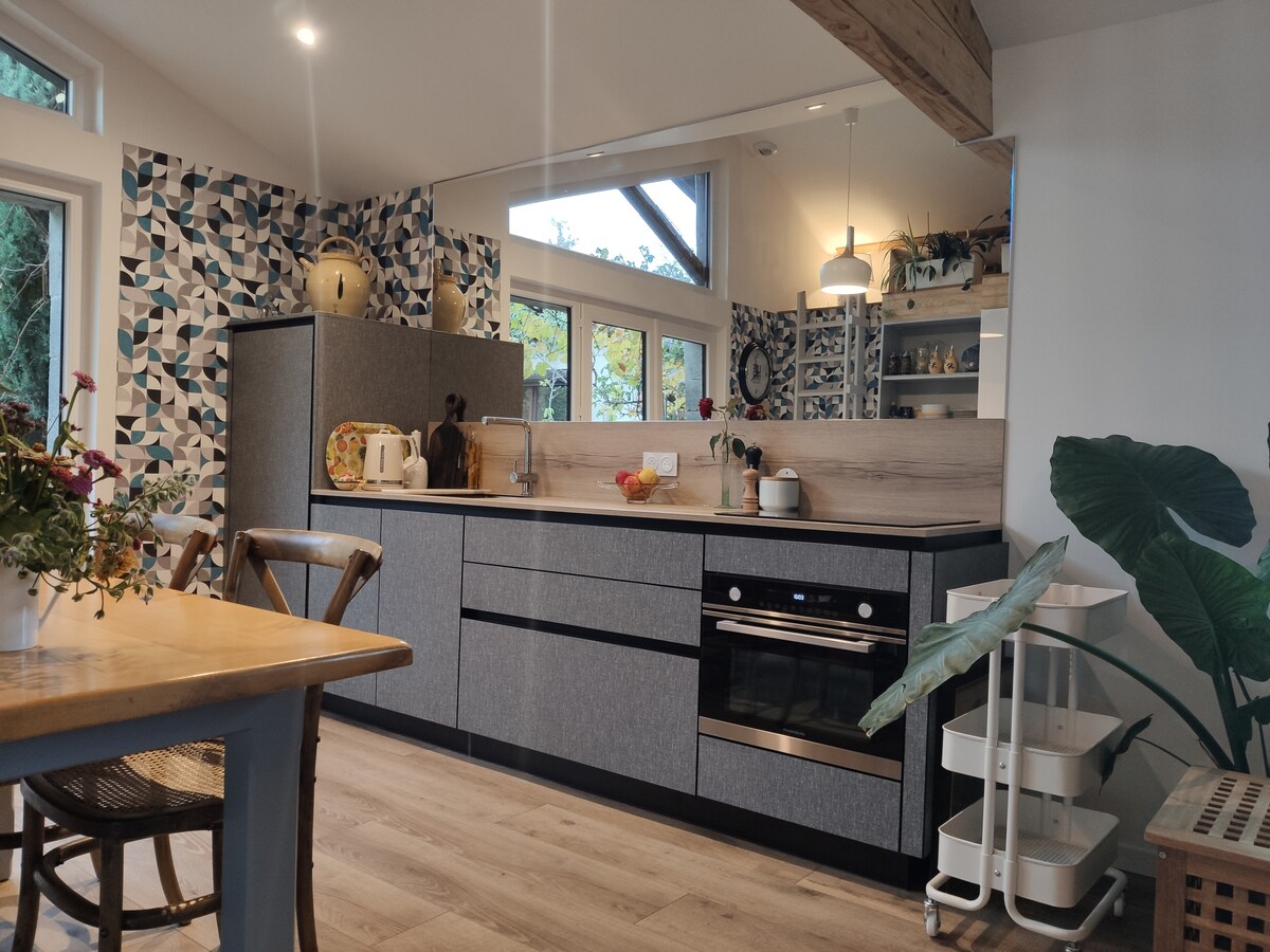 Veselimo se, da vas bomo lahko sprejeli v tej novi in popolnoma opremljeni nastanitvi, ki se nahaja na ravni vrta naše hiše. Sestoji iz spalnice (postelja 160 x 200), kopalnice (prha) in opremljene kuhinje, ki je odprta v dnevno sobo z raztegljivim kavčem (160 x 200). Rjuhe, brisače in čiščenje so vključeni. Neodvisni vhod je skozi zasebno teraso, kjer lahko uživate v čudovitem razgledu na Monts du Forez. Nahaja se 5 minut od avtocest. Veselim se, da vas bom lahko sprejel.