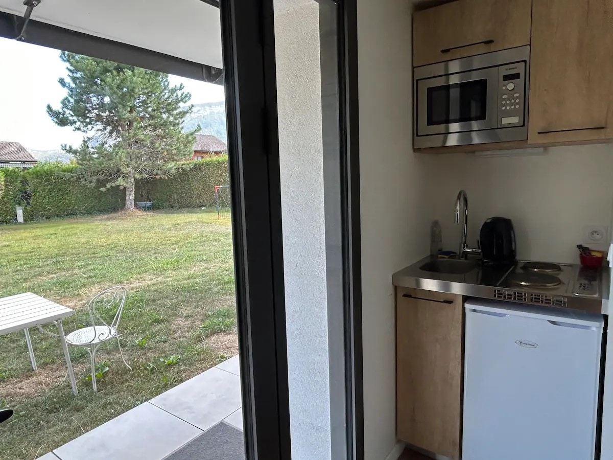 Studette situé en rez-de jardin d'une maison savoyarde rénovée en 2022. Très belle vue sur les montagnes (Dents de Lanfon et Tournette), à proximité du lac et de la plage, proche du centre. Ce logement comprend une kitchenette (1 plaque de cuisson, 1 petit évier, 1 petit réfrigérateur, 1 four micro-ondes), une table et 2 chaises, une salle de douche, un canapé haut de gamme convertible en lit, 1 tv. Un coin jardin est à votre disposition avec transats et table d'extérieur. Parking privé.
