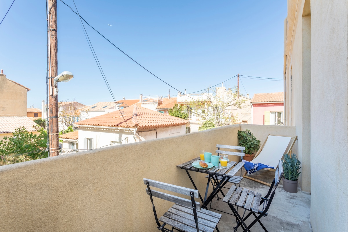 Svetlo stanovanje s panoramskim pogledom na morje iz vsake sobe. Uživali boste v osupljivih sončnih zahodih z velike terase, sprostili se v hamacu in uživali v razgledu! Na priročni lokaciji v osrčju Endoumeja, ene najboljših sosesk v Marseillu, ste le 2 minuti hoje stran od morja. Klimatska naprava in hitra in zanesljiva povezava Wi-Fi.