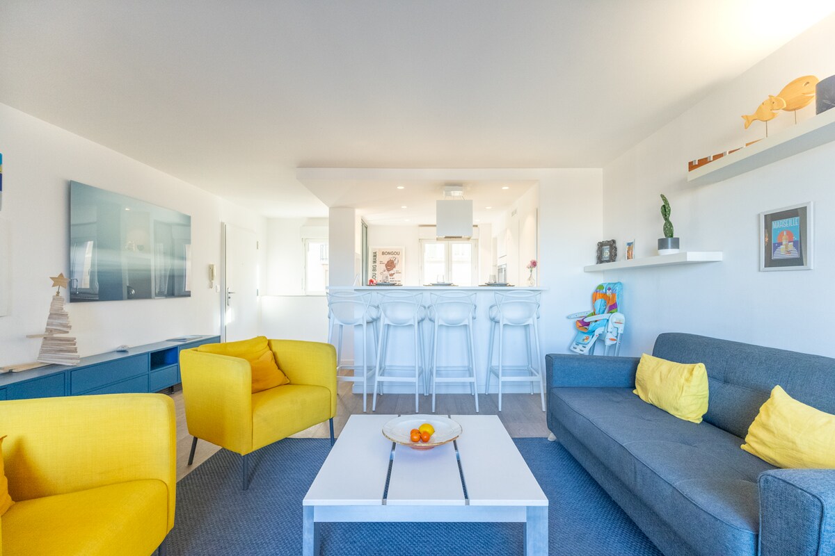 Svetlo stanovanje s panoramskim pogledom na morje iz vsake sobe. Uživali boste v osupljivih sončnih zahodih z velike terase, sprostili se v hamacu in uživali v razgledu! Na priročni lokaciji v osrčju Endoumeja, ene najboljših sosesk v Marseillu, ste le 2 minuti hoje stran od morja. Klimatska naprava in hitra in zanesljiva povezava Wi-Fi.